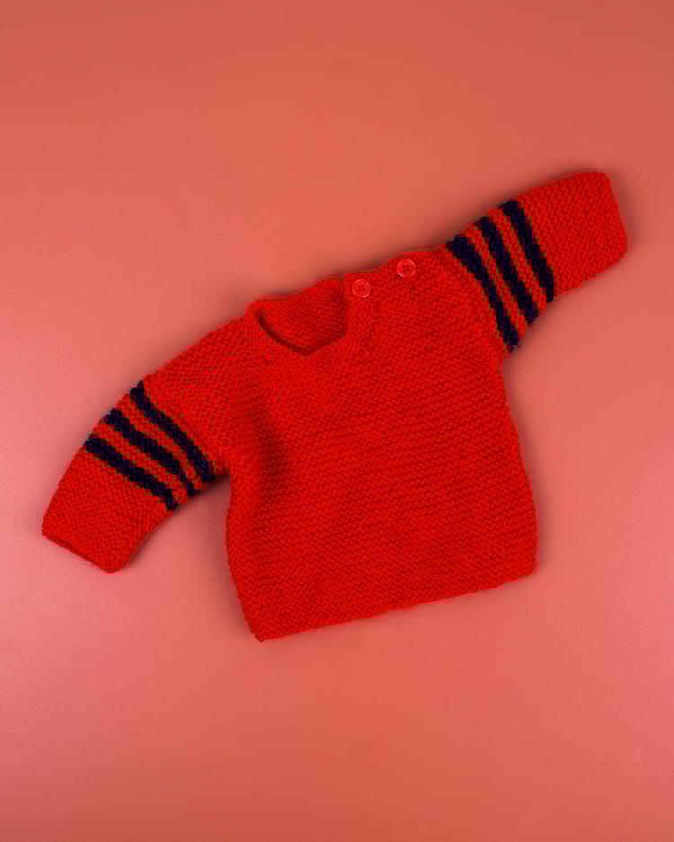 Fire engine red wool baby jumper with navy stripes on the arms. Knitted for someone special but now looking for its second home. In well-cared-for second-hand condition.