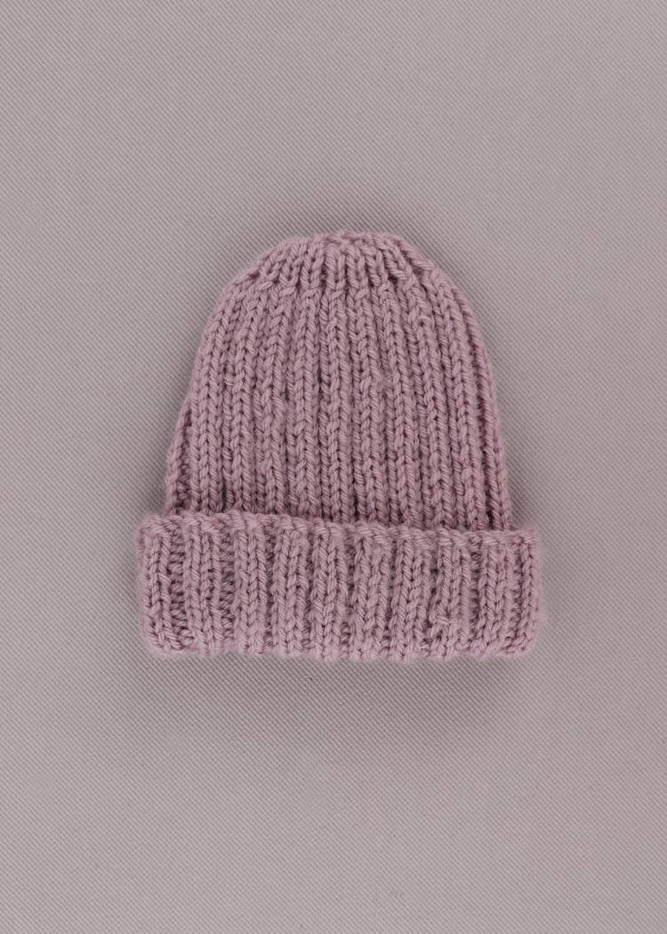 Mauve wool baby beanie with a rolled brim. Knitted for someone special but now looking for its second home. In well-cared-for second-hand condition.