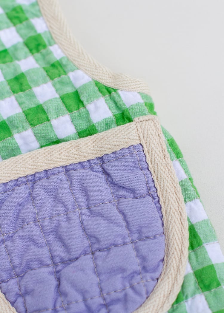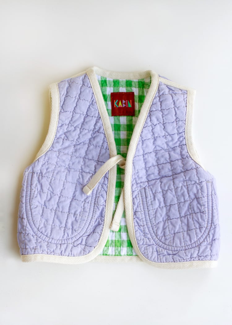 This playful handmade quilted vest is made from a lovingly patchworked cotton outer with a cotton lining, interlined with bamboo cotton wadding. Statement pockets at the front and completely reversible. It closes at the front with a tie and all seams have been bound in twill tape making this vest heirloom quality. Made to last.